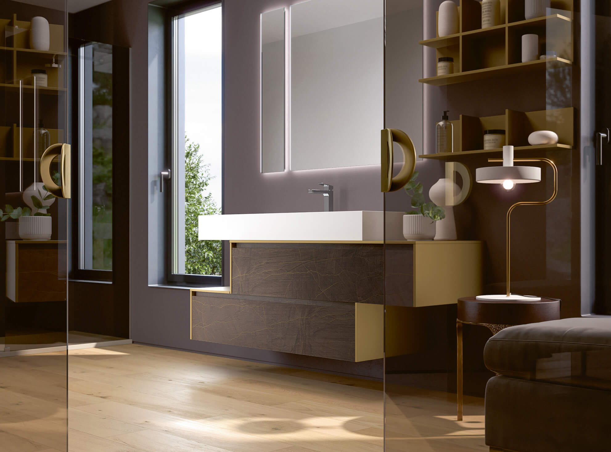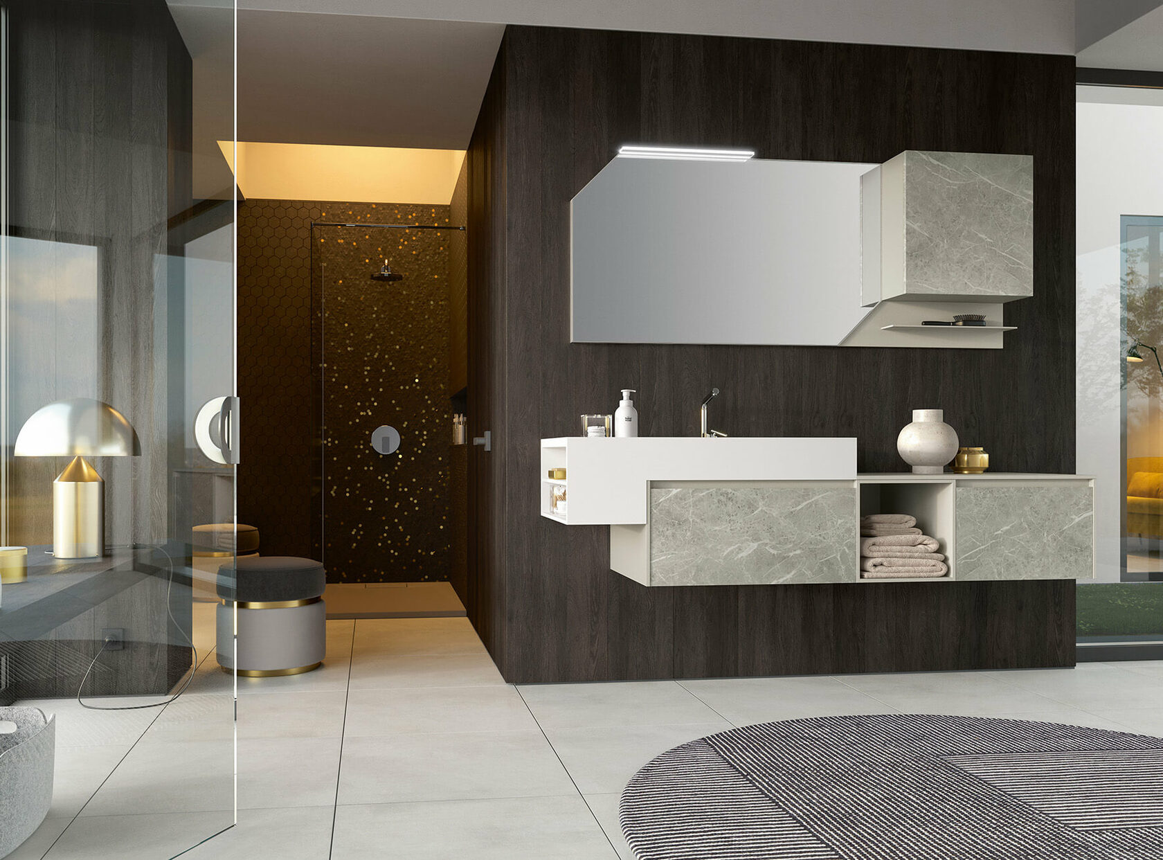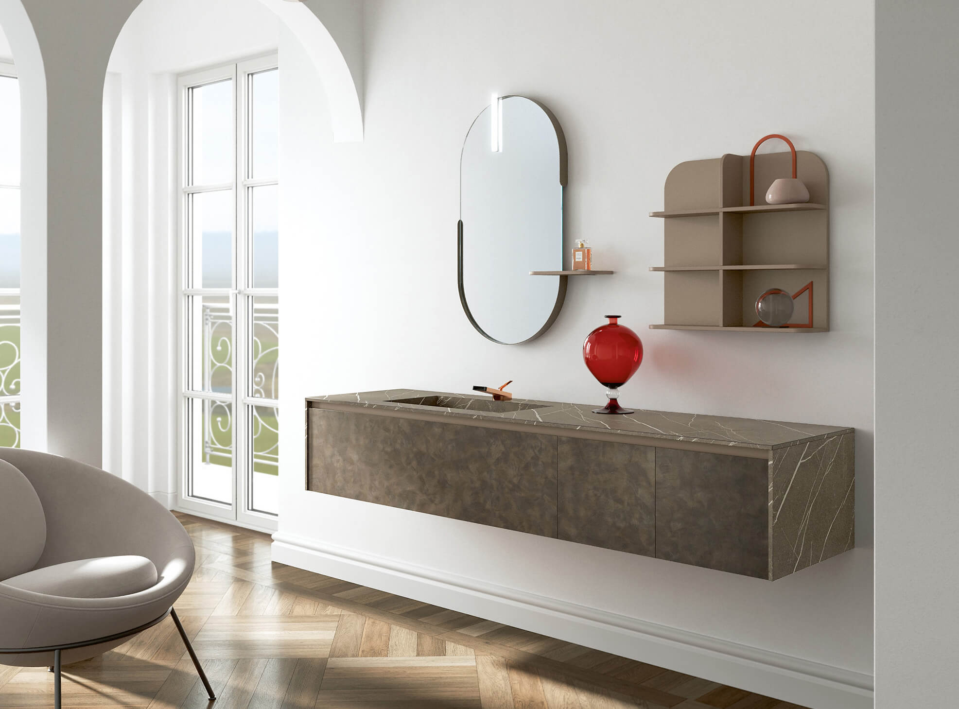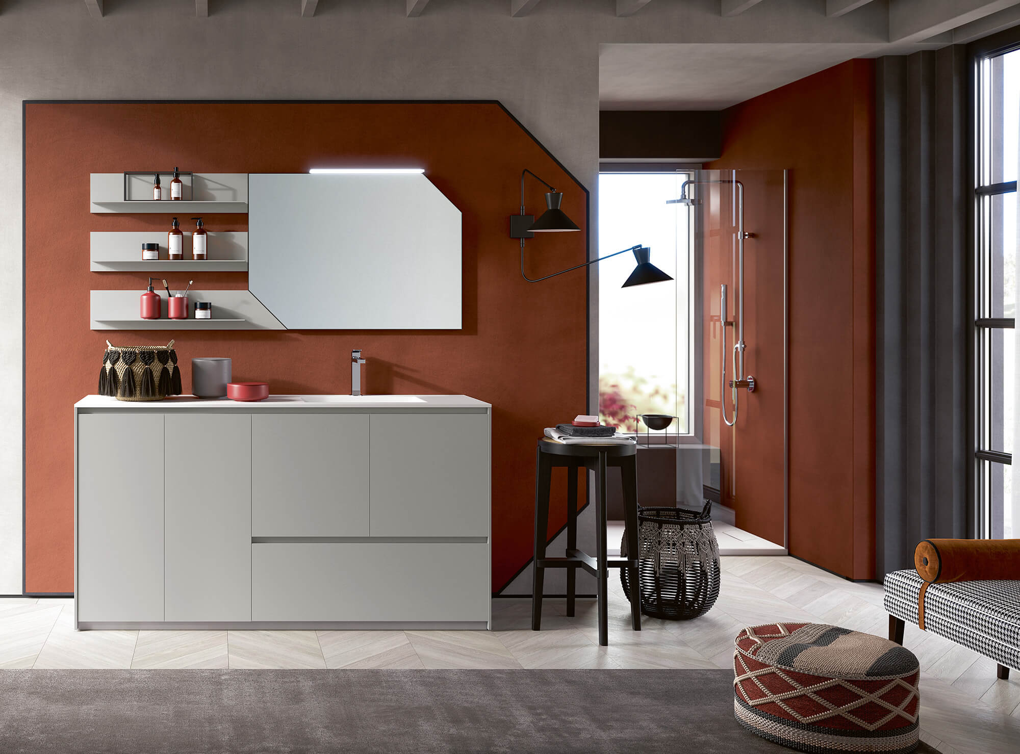 A distinctive contemporary project developed on the choice of innovative materials such as HPL and Fenix. The plain door and its grip with inclined edge enhance these materials. The side panels of the cabinet can be provided in any of the finishes available, giving a wide range of opportunities for customisation.