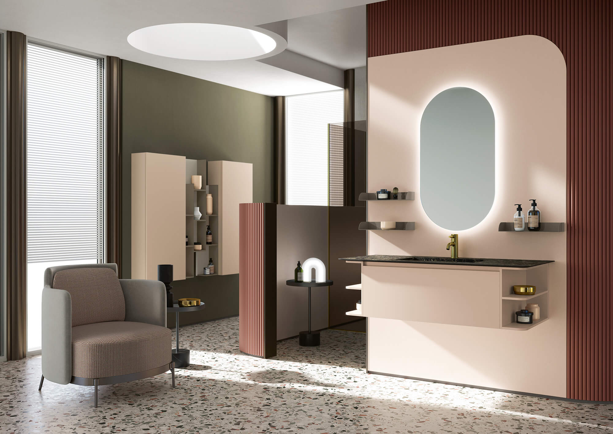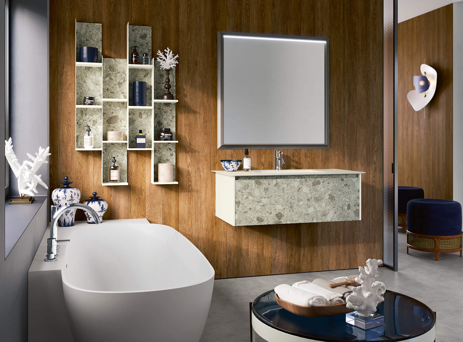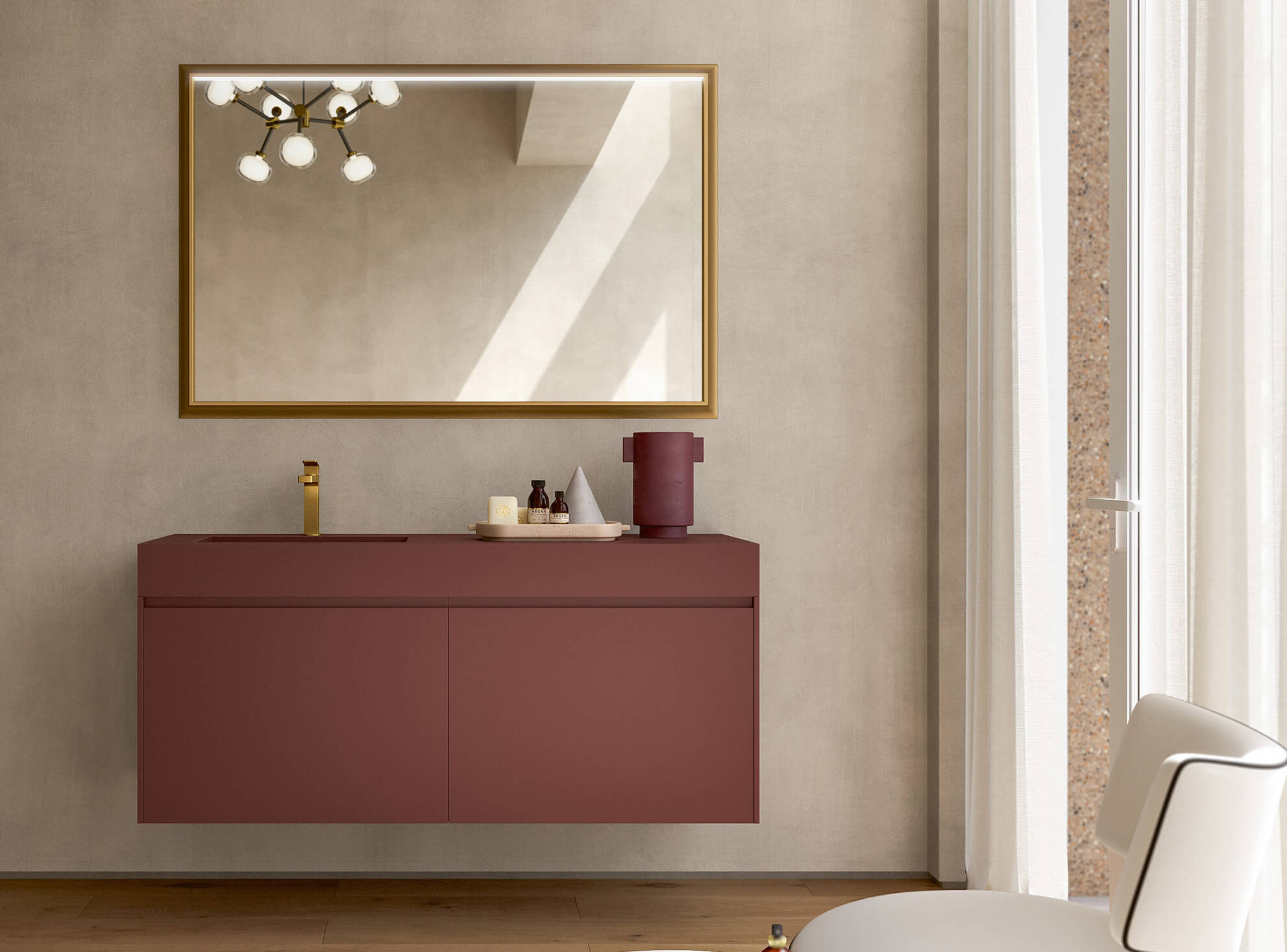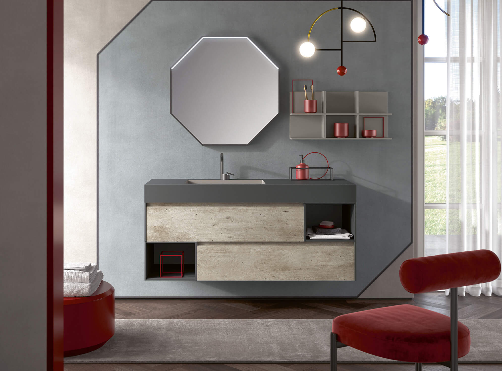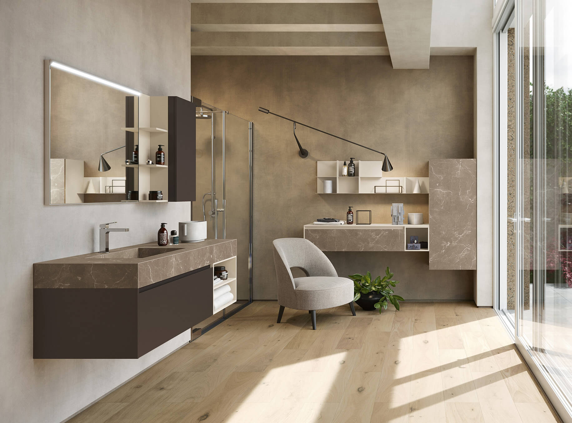 A distinctive contemporary project developed on the choice of innovative materials such as HPL and Fenix. The plain door and its grip with inclined edge enhance these materials. The side panels of the cabinet can be provided in any of the finishes available, giving a wide range of opportunities for customisation.