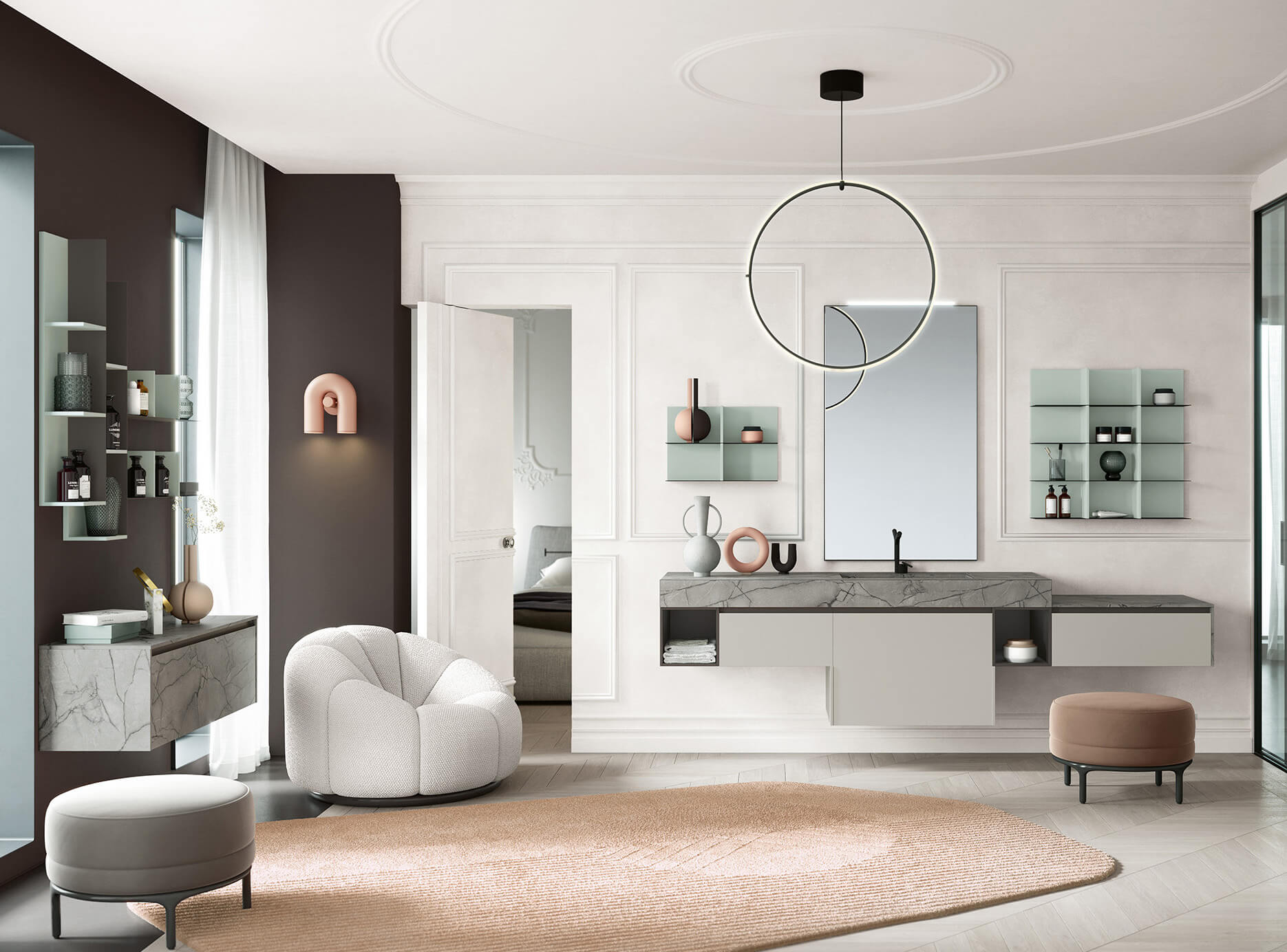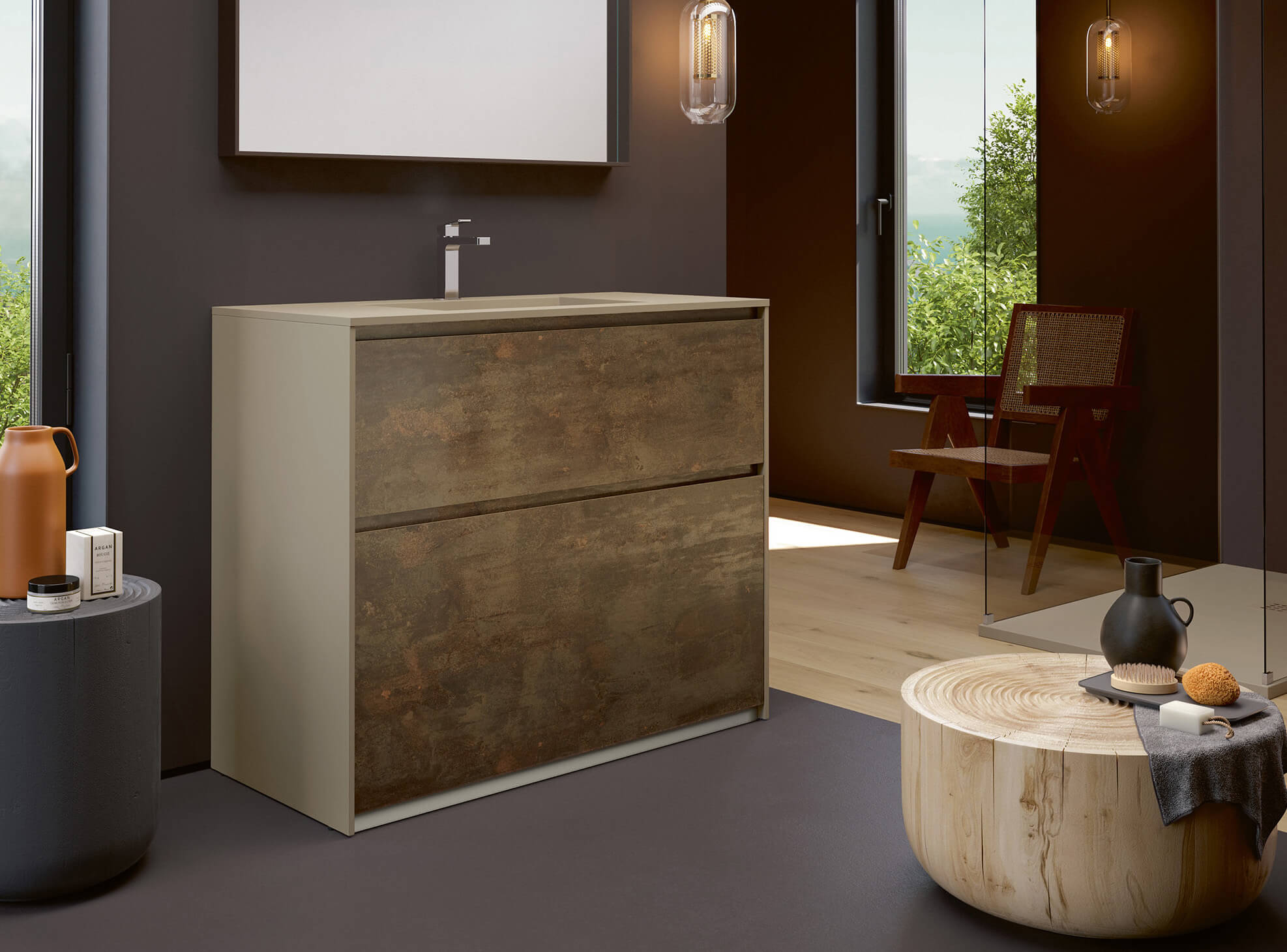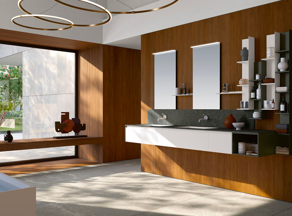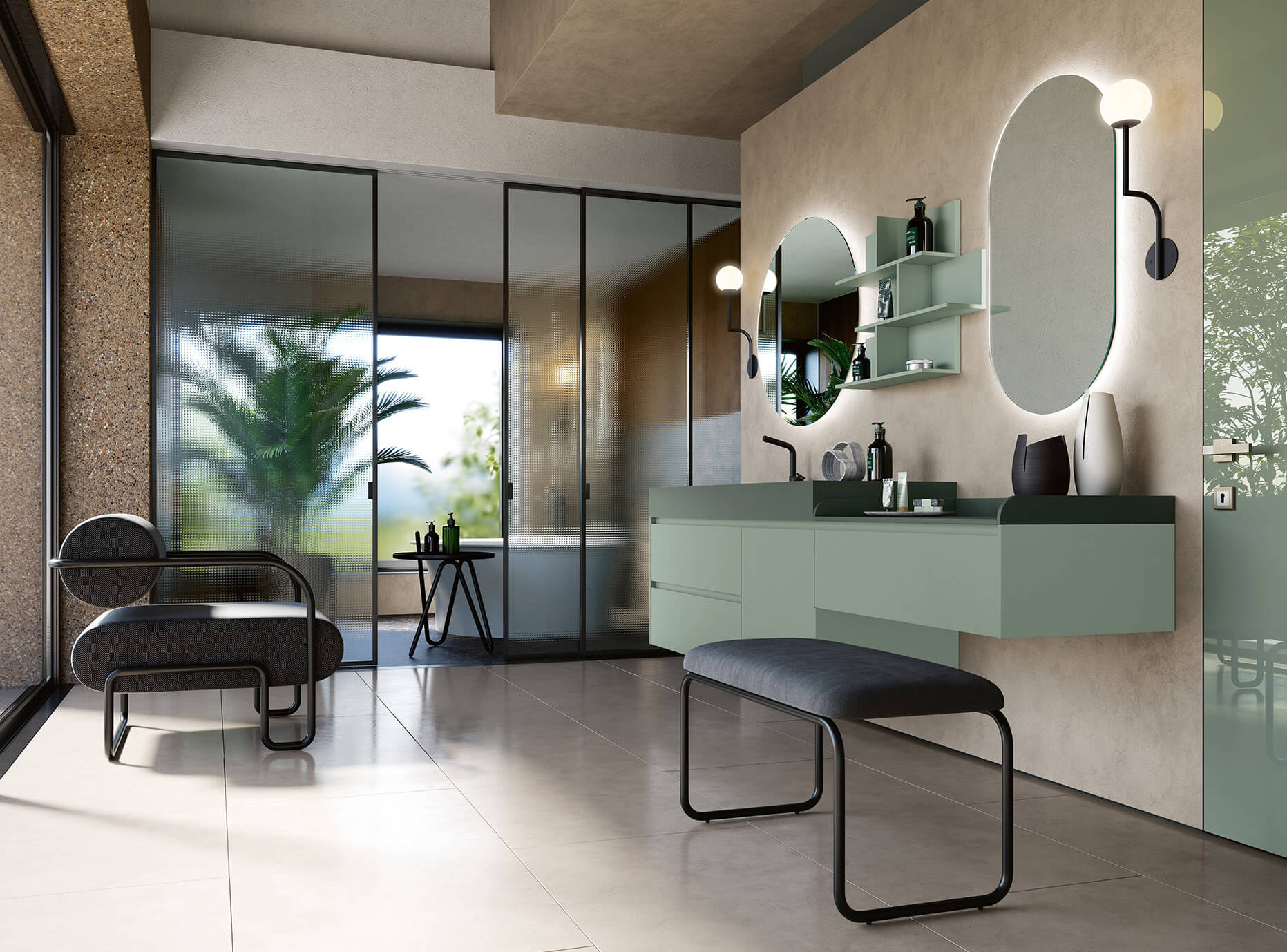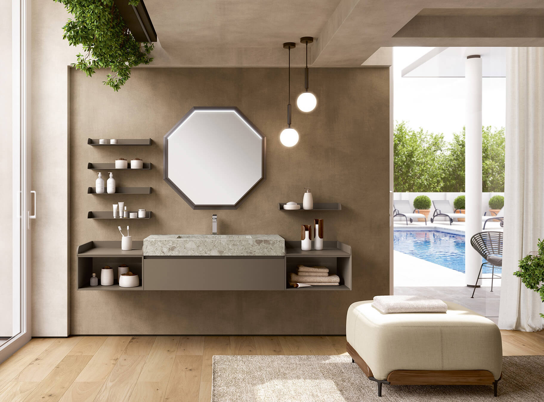 A distinctive contemporary project developed on the choice of innovative materials such as HPL and Fenix. The plain door and its grip with inclined edge enhance these materials. The side panels of the cabinet can be provided in any of the finishes available, giving a wide range of opportunities for customisation.